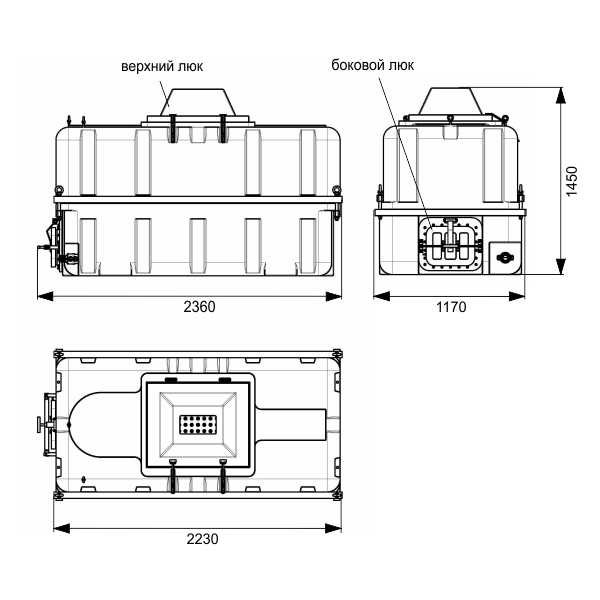 На боковой стенкеконтейнера установлен пластиковый разгрузочный откидной люк с отверстием 320 х 250 мм. Перед боковым люком (изнутри резервуара) установлена подъемная шторка шибера, позволяющая регулировать выгрузку рыбы. Рукоятка подъема шторки - выведена на верхнюю часть контейнера.