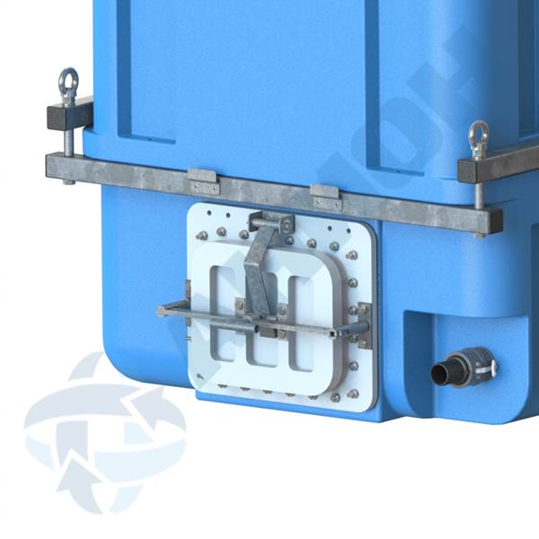 В нижнем углу торцевой поверхности контейнера размещена заслонка 2” с защитным (от попадания в слив мелкой рыбы) грибком и штуцером для подключения сливного шланга. Рукоятка ручного открытия / закрытия выведена на верхнюю поверхность контейнера для удобства использования.